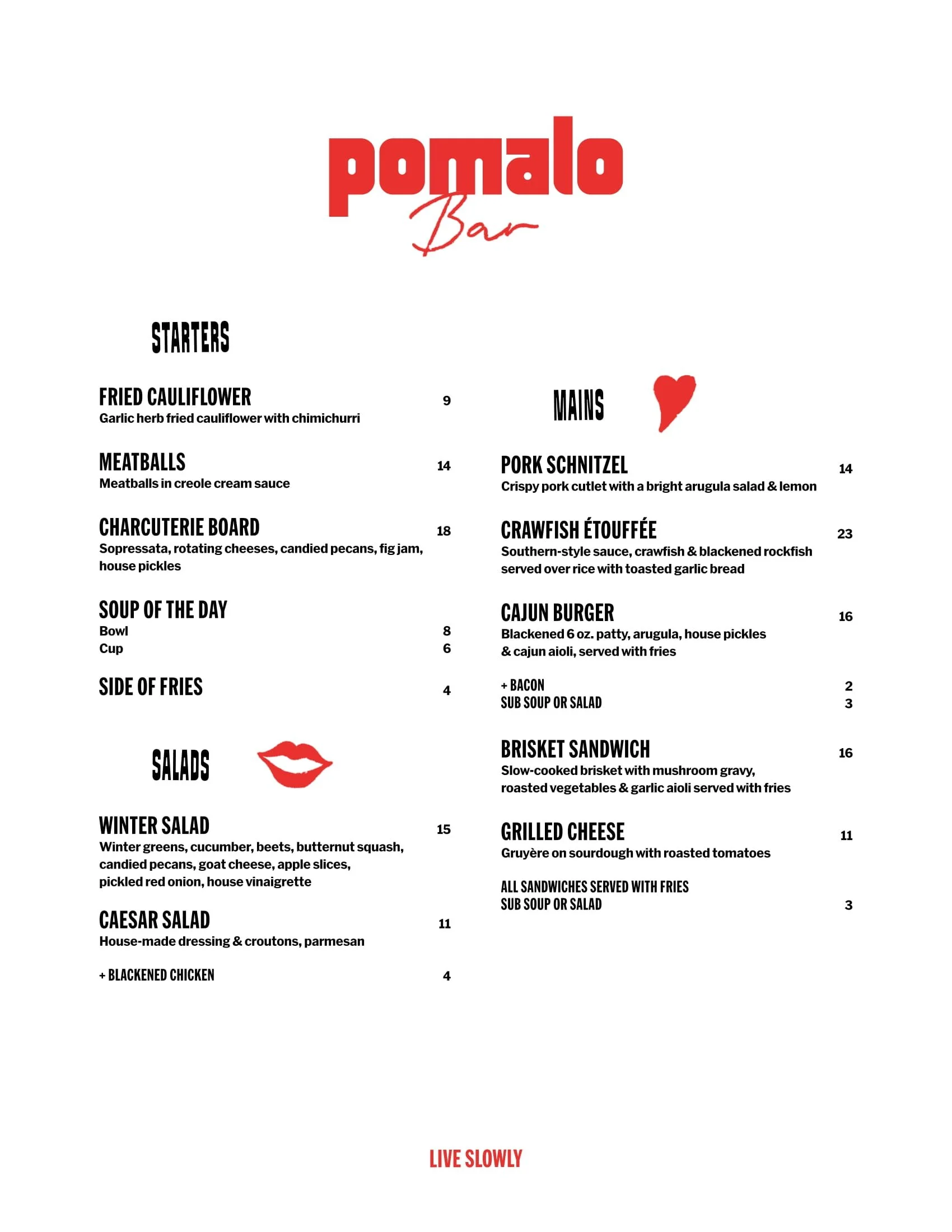 At Pomalo, we keep things simple and satisfying. Our menu blends Italian and soul food influences to bring you an elevated comfort dining experience. Made with care, served with a smile, and always in the spirit of Pomalo.